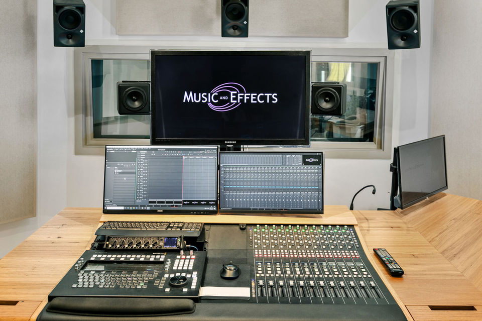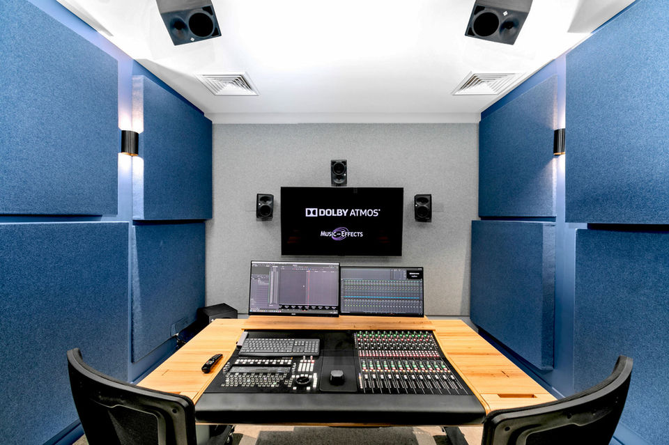 Newly constructed, our Dolby Atmos studio has been designed and built specifically to edit and mix immersive audio content for streaming service and other home entertainment products. It has a 7.1.4 monitoring layout for a fully immersive audio experience paired with a Dolby Vision compatible 65-inch OLED television for spectacular content viewing. The DaVinci Resolve Studio system is controlled with a Blackmagic mixing console housed in a custom-built hardwood desk. The studio is structurally separated from the surrounding rooms to reduce ambient noise, and the interior has been fine-tuned to achieve the required noise ratings. With no windows, the lights can be dimmed to reproduce a more cinematic feel, or kept bright to simulate a lounge room environment.