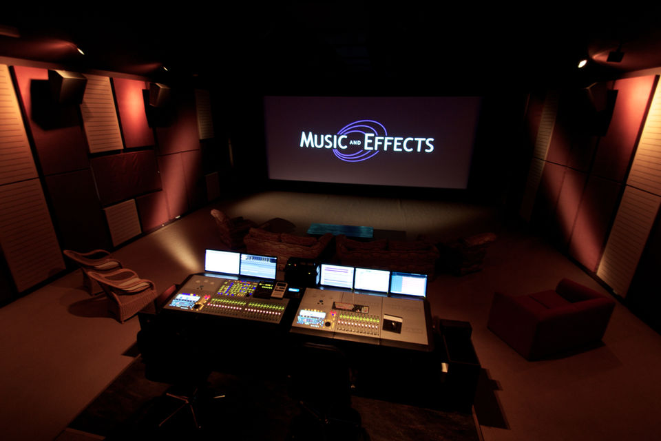 Our Dolby Digital licensed mixing theatre features an 8.8 metre perforated projection screen, with a professional 2K cinema projector. The 7.1 speaker system allows projects to be screened and mixed in a full theatrical environment, ideal for feature films, documentary features, short films and cinema commercials. The console is composed of two Fairlight systems and one ProTools Ultimate system, all interconnected to provide the power and adaptability required for complex theatrical mixes. The theatre has a flexible layout, comfortably seating up to 40 screening guests.