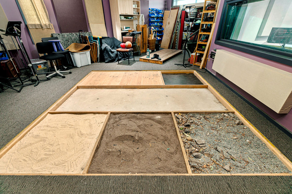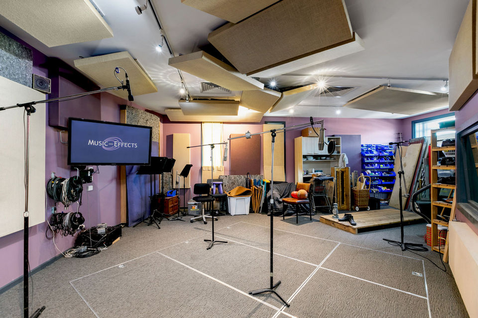 Our recording studio was designed by acoustic experts and has been specifically constructed so that the room is isolated from external audio and vibration. This creates an ultra-quiet environment for the highest quality audio recording. Foley pits are built into the floor, including concrete, floorboard, gravel, sand, and earth surfaces. We have a wide range of props available in the studio for foley recording.